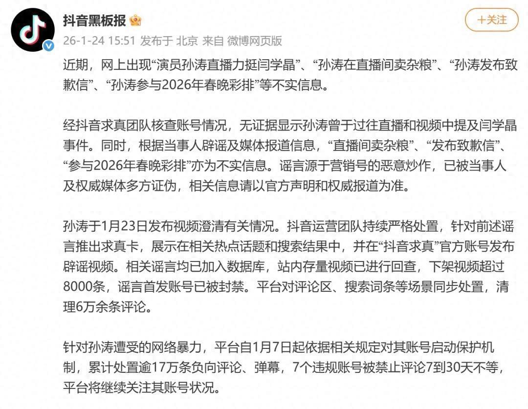 抖音后来也出手了,发了个黑板报,说了处理结果,针对这些谣言,抖音推出了什么求真卡,还发了辟谣视频,下架了好多视频,封禁了那些最开始造谣的账号,这也算是亡羊补牢吧。他们好像还专门保护了孙涛的账号,处理了很多负面评论,还禁止一些账号评论,哎,也算是做了点事吧。抖音说要大家一起维护网络环境,不信谣,不传谣,这个口号喊了很多年了,但感觉效果一般,还是那么多人喜欢看热闹,传播谣言,很多人看完这个故事,都会去想,网络暴力真的太可怕了,一个人什么都没做,就可能因为一些谣言被攻击,太不公平了。